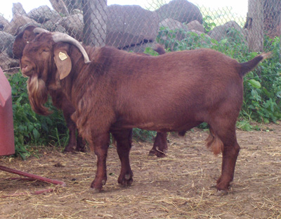 Born March 3, 2003 [deceased]. He's a deep mahogany solid red buck that was disbudded when we purchased him,
